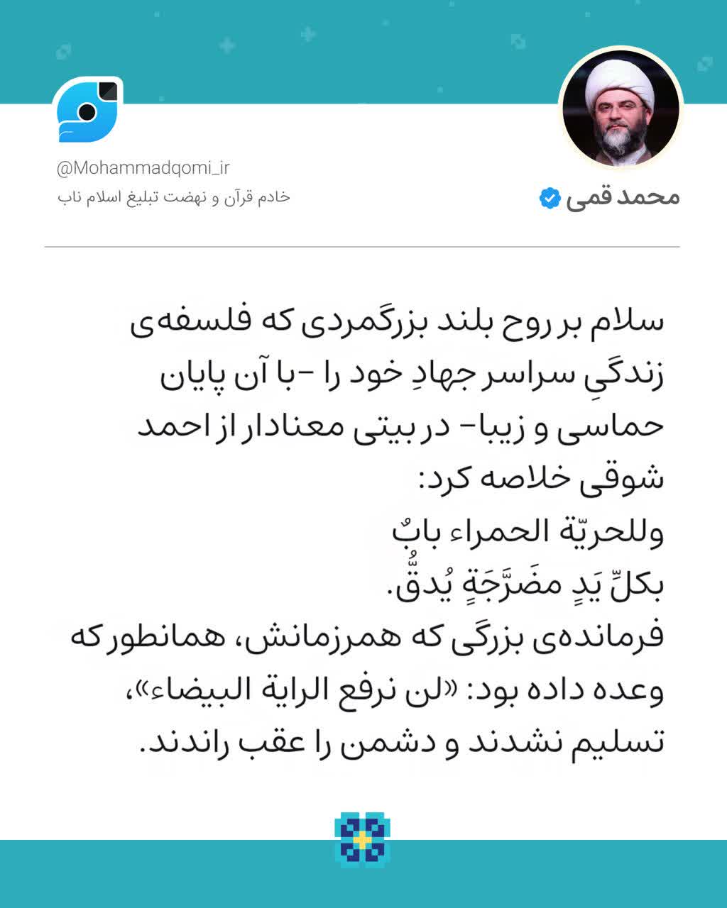 به گزارش روابط عمومی سازمان تبلیغات اسلامی، حجت‌الاسلام محمد قمی، رئیس سازمان تبلیغات اسلامی در سالروز شهادت یحیی سنوار در صفحه شخصی خود در شبکه اجتماعی ویراستی نوشت؛