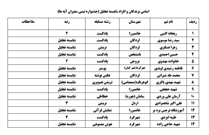 اسامی برگزیدگان جشنواره به شرح ذیل اعلام می‌شود: