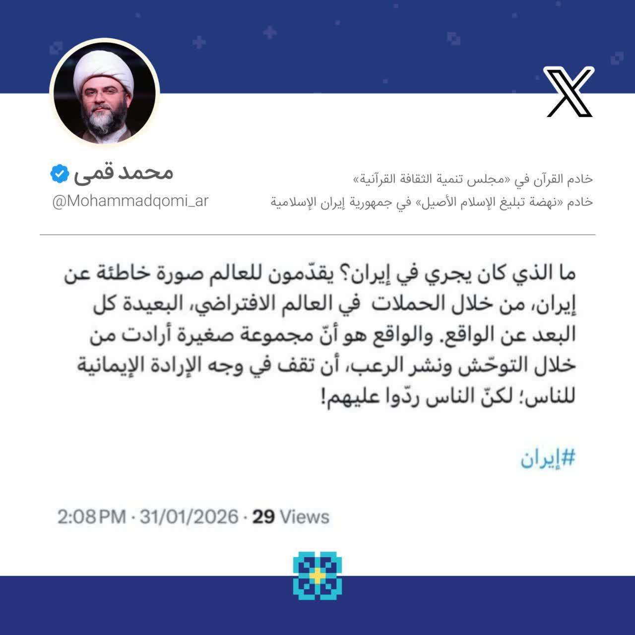 به گزارش روابط عمومی سازمان تبلیغات اسلامی، حجت‌الاسلام محمد قمی، رئیس سازمان تبلیغات اسلامی در صفحه شخصی خود در شبکه اجتماعی ایکس ویژه مخاطبان عرب زبان نوشت؛