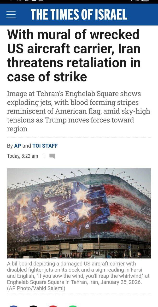 رسانه عبری‌زبان «تایمزآو اسرائیل» با اشاره به تصویر ناو هواپیمابر ویران شده آمریکایی، به این نکته تأکید دارد که با توجه به ناوهای آمریکایی که به سمت ایران روانه شده‌اند، ایران زبان تهدید خود را در قالب این دیوارنگاره بیان کرده و به آمریکا هشدار داده است که هرگونه حمله احتمالی، پاسخی سخت و دندان‌شکن خواهد داشت.
