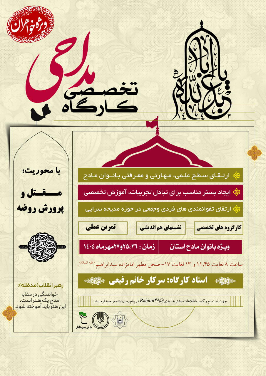 وی گفت : استاد این دوره، سرکار خانم رفیعی، از اساتید برجسته و صاحبنظر در حوزه مدیحهسرایی بانوان، با ارائه مباحث تخصصی، کاربردی و کارگاهی، به آموزش شرکتکنندگان خواهد پرداخت.